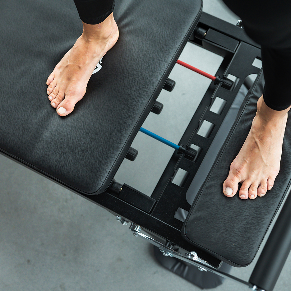 ➡️ 5 répétitions par côté Posez un pied sur la plate-forme et l'autre sur le chariot.